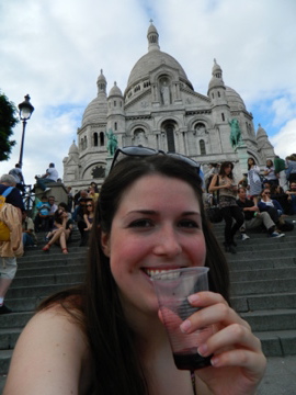 Later, I stopped at a restaurant for some eats. I chose a way-too-expensive option accidentally (water for 5 euros!), but it was nice and constituted my first warm meal in days. I chose an outward-facing seat on the patio and people watched for a while. I spotted a total of 12 people carrying baguettes (yes, I was totally keeping track). After that I went to the bakery next door and bought a delicious eclair to save for later. That was followed by the Parisian version of the Grouse Grind on the way up to the Sacre Coeur, which is grand and opulent and has one of the best views of Paris. There, I sat on the steps, ate my eclair and drank more cheap wine while taking in the view. From there, I wandered to the Moulin Rouge, which is underwhelming in person and nothing like the movie. Boo.