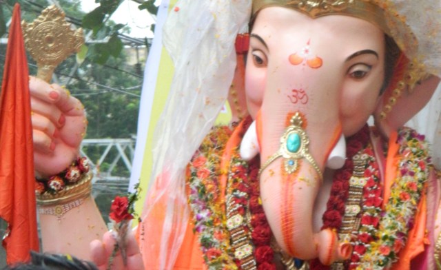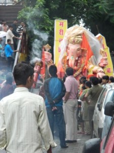 Yesterday we accidentally stumbled upon the biggest festival in India. It’s called Ganesh Chaturthi and it’s pure insanity. I don’t think I’ve ever seen so many people in the streets, but I know I’ve never seen so many people dancing in the streets. Basically, the festival celebrates the Hindu god Ganesha, who according to Wikipedia, “is widely worshipped as the god of wisdom, prosperity and good fortune and traditionally invoked at the beginning of any new venture or at the start of travel.” The festival is celebrated in many ways, but one of the practices we were struck by was the fact that several people were carrying Ganesha statues. We also saw a huge statue of the god as part of a parade. All of these statues were taken to the beach and placed into the Arabian sea, an event that we watched from Chowpatty Beach with a few million other people. Before that finale (and the copious amounts of fireworks after), we followed a procession of people wearing orange, who were celebrating very loudly with drums and with a cannon that shot flower petals. They carried a huge statue of Ganesha behind them, and they even asked us to walk with them towards the beach.