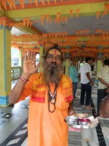 We then walked up to a platform where we were served more chai, and our hostel manager Raj told us a story of how he slept in that very place one night and woke up to find tiger prints beside him. We then walked farther into the forest and found the homes of some “baba’s”. Apparently, they live on very little food and smoke close to 100 pipes filled with hash a day. There, we sat on some rugs and were served yet another metal cup of chai. We watched as an old baba dressed in a long orange cloth with a long grey beard smoked a funnel-shaped pipe packed with tobacco and hash (I think) like a pro. We then moved on to breakfast near the temple (around the temple there were several buildings and platforms that I assume are all part of the temple in some way or another). We were served small, free plates of curried rice and vegetables, along with chai (of course!). After a rocky, wet and hilarious journey back to the car in the rickshaw, we made our way back to the hostel. It was a great day and I learned a lot about Hindu culture, though there is obviously a lot of it I still don’t quite understand, though I’d love to find out.