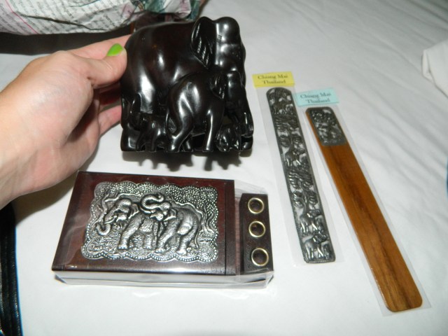 I just got back from a shopping expedition at the huge Sunday night market here in Chiang Mai, and at this point it’s clear that my future apartment will be filled with elephants. Here’s my elephant-related haul so far: