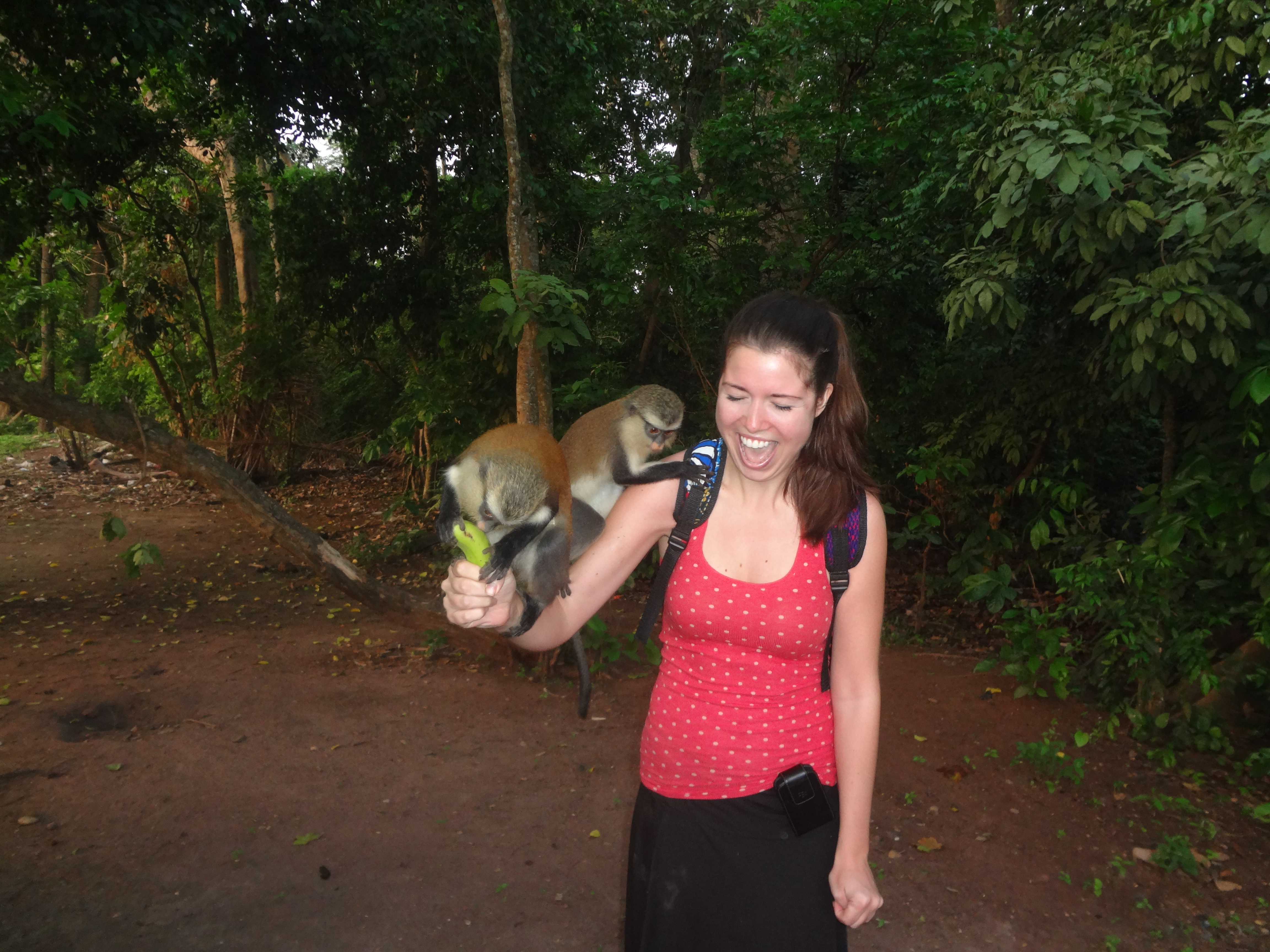 Bright and early the following day we set out on our tour. The village is basically set right alongside the forest where the six troops of monkeys live, so after a short walk we were welcomed with the inquisitive eyes of Mona Monkeys. Our guide brought bananas, and the monkeys definitely knew what that meant. The guide handed me a banana and instructed me to hold out my arm and hold the banana halfway. Next thing I knew I had not one but two monkeys clinging onto my arm, quickly prying off the banana skin with their cute but sharp little black paws. It was awesome.